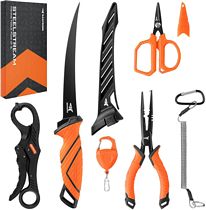 The KastKing SteelStream 6pc Fishing Tool Kit is an all-in-one bundle tailored for anglers who want reliable performance and versatility in one compact package. This set includes a 7” fillet knife, fish lip gripper, fishing pliers, braid scissors, retractable lanyard, and sheath—all stored in a durable molded case. It’s ideal for fishing trips, dockside prepping, or backyard cleaning tables. The knife features a 420 stainless steel blade that’s strong, corrosion-resistant, and retains its edge well. It’s paired with a textured rubber handle that offers a secure, non-slip grip even when wet, ensuring both comfort and safety. The pliers, made from carbon steel and coated with corrosion-resistant Teflon, are equipped with crimpers, split ring tips, and line cutters—useful for both saltwater and freshwater scenarios. The titanium-coated braid scissors offer clean cuts, while the fish lip gripper floats—perfect for avoiding accidental loss overboard. Reviewers love the comprehensive nature of the kit, especially for those new to fishing or who want everything in one place. The retractable lanyard and molded case are highly appreciated for on-the-go utility. Some users find the sheath a bit basic and wish the knife’s edge retained sharpness longer with heavy use.